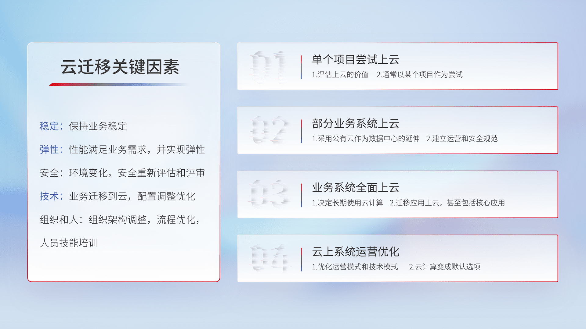 结合实际业务,,,从规划设计、、、、云平台选型、、云原生改造、、、、数据迁移、、、、集成交付,,,迁移全过程为客户识别最佳上云路径,,做好风险识别管理,,,,设计网络架构、、、、身份权限、、安全审计合规、、、、操作审计、、、日志审计、、、监控告警策略、、、、多站点容灾设计等,,对云上基础设施进行整体规划,,提升IT治理水平,,,,以满足弹性、、高可用、、高性能的需求。。。