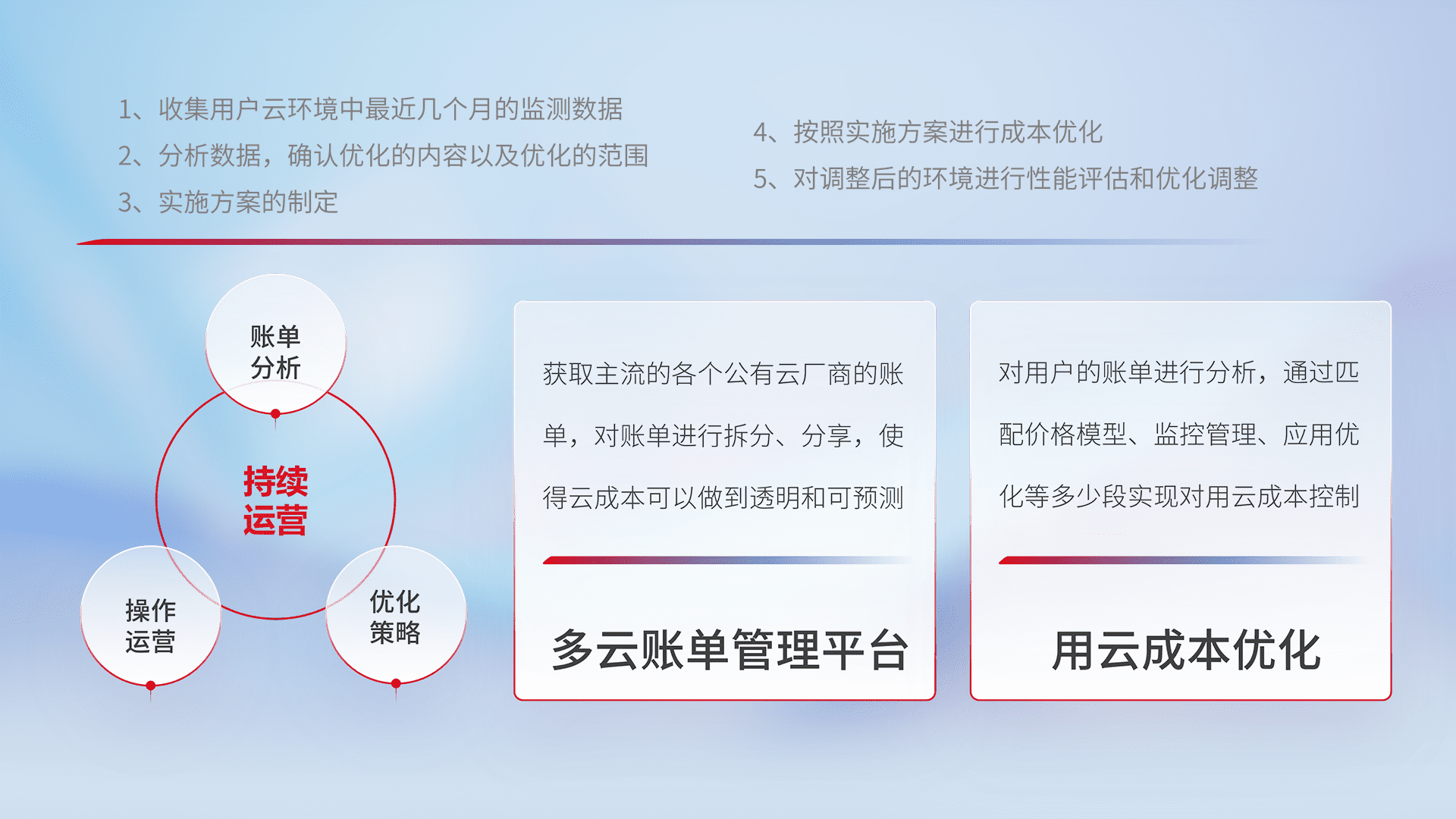 通过多云纳管,,,,以统一的资源数据模型把客户的云资源进行抽象和封装,,进而实现对多云资源的统一操作,,,,保障云资源管理的可靠性、、、、稳定性与可用性。。量身定制化运维内容,,,配置、、、开发运维、、、补丁管理、、备份、、、、监控、、、认证和访问管理、、、、审计和日常巡检等,,保障在用云过程中的可靠度,,,,稳定度以及高可用率。。。